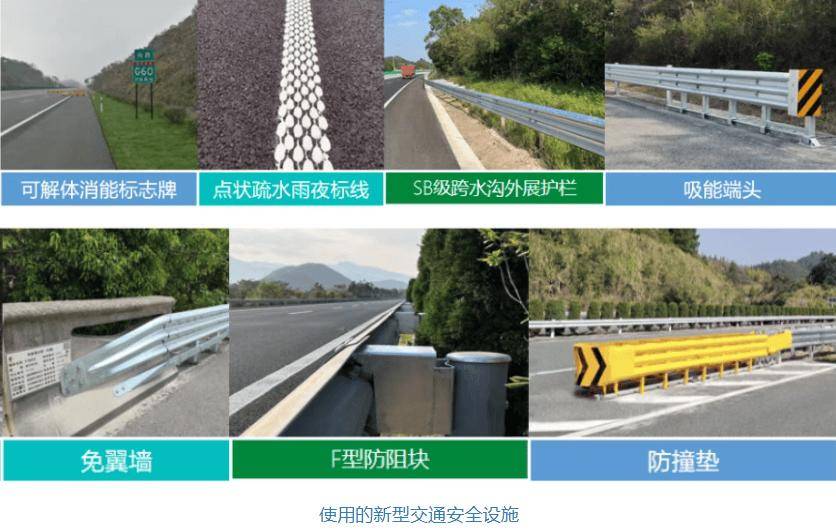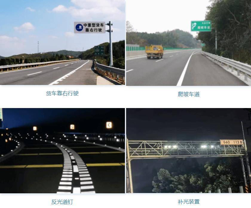 通行管理措施方面,全线设置货车靠右行驶标志;利用硬路肩设置爬坡车道,联合开展干线通道主动管控;对线处短直线处圆曲线半径协调不良路段)分类优化,视情选择增设减速标线、高亮疏水标线、反光道钉和线形诱导标等措施;中央分隔带视距不足处通过内侧增加减速标线及标线外侧偏移优化;完善补光装置等。